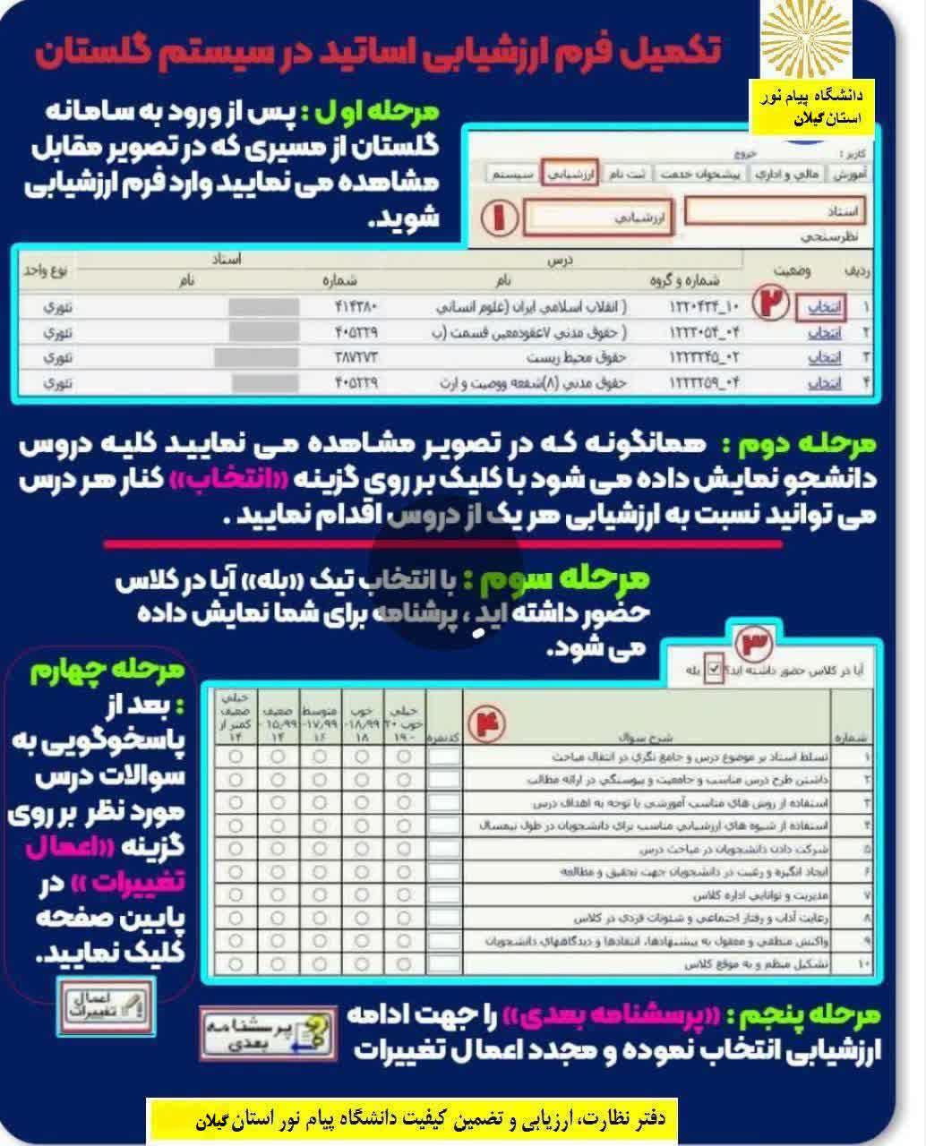 گامهای انجام ارزشیابی اساتید نیمسال اول 1405-1404 در سیستم گلستان از تاریخ 19 آبان تا 19 آذر گام ۱: در سیستم گلستان وارد منوی زیر شوید: منوی ارزشیابی ⬅️ استاد ⬅️ ارزشیابی گام ۲: در بخش سوال "آیا مایل به شرکت در ارزشیابی هستید؟" گزینه بله را انتخاب کنید. برای مشاهده فرم ارزشیابی هر درس روی دکمه انتخاب در کنار هر کد درس کلیک کنید تا به صفحه بعدی انتقال یابد. گام ۳: در این صفحه، با انتخاب جواب هر سوال در انتهای پرسشنامه، روی اعمال تغییرات کلیک کنید تا نمره نهایی ارزشیابی استاد آن درس درج شود. سپس روی دکمه پرسشنامه بعدی بزنید تا به پرسشنامه درس دیگر انتقال یابد. * قابل ذکر است دانشجویانی مجاز به ارزشیابی هستند که پیشتر گزینهی "بله" را برای حضور در کلاس درس استاد مورد نظر انتخاب نمایند. * توجه داشته باشید دانشجویانی که بدهکاری شهریه دارند نیز میتوانند در ارزشیابی اساتید شرکت کنند. *نتایج ارزشیابی کاملا محرمانه و بدون مشخصات دانشجویان است و در اختیار اساتید نیز قرار نخواهد گرفت.